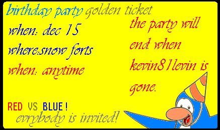 BEHOLD YOU GOT A GOLDEN TICKET FOR THE BIRTHDAY PARTY! SEND THIS TO OTHER PEPOLE ON THE WIKI. HURRY YOU HAVE NO MUCH TIME THE PARTY IS TOMMORW! KEVIN WOULD LIKE TO MEET YOU!