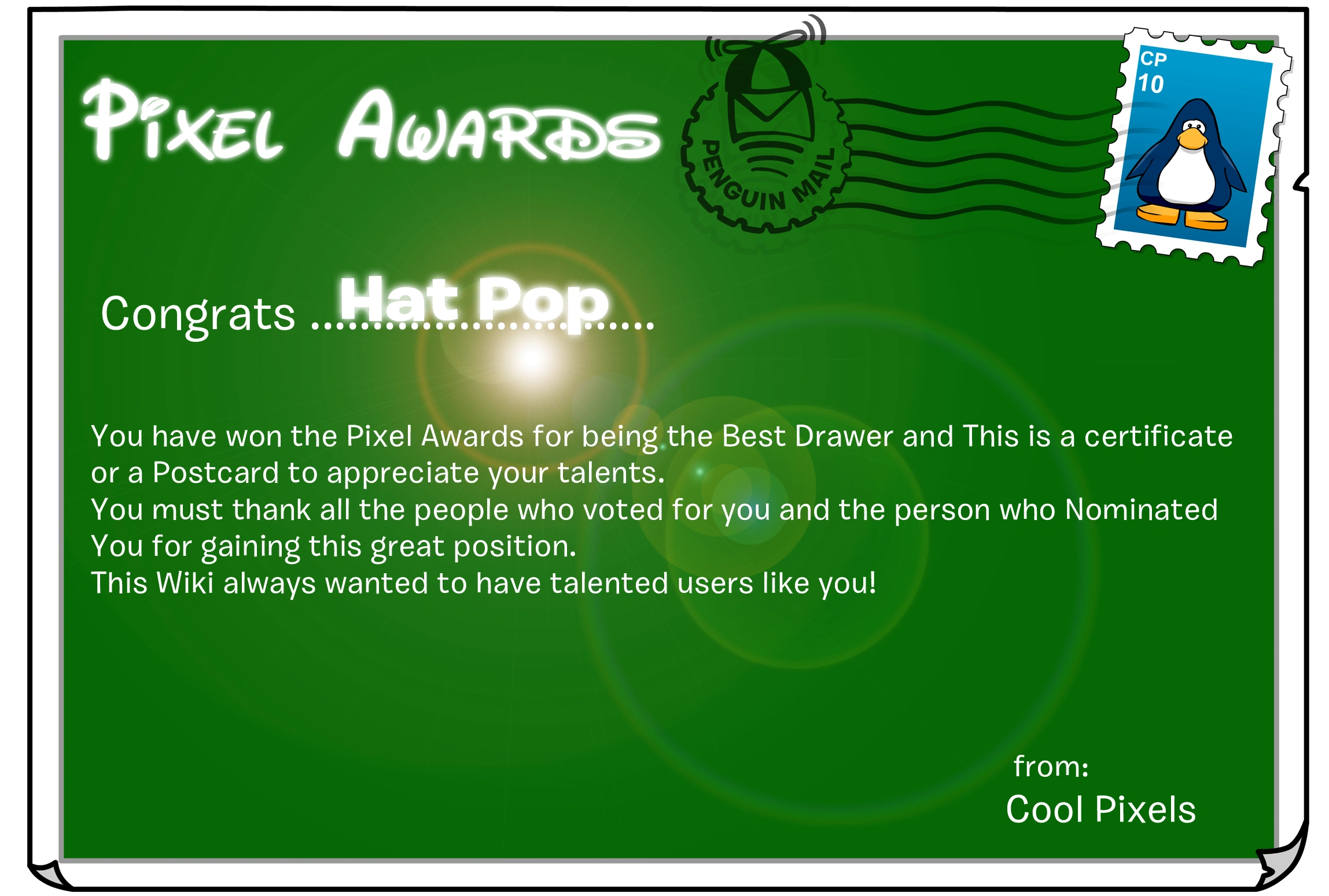Congrats Hat Pop! You have successfully won the category for Best Drawer in Pixel Awards. You must thank all your voters and Mariocart25Charizard for nominating you! And Don't forget to checkout Pixel Awards to know the new winners or nominate your friend for a category. So, here is a prize for your talents:
